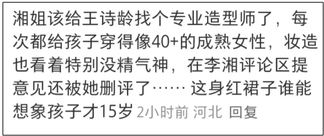 面对越来越多的网友质疑,李湘没有回应,但有网友提到,她在评论区留言,建议李湘给女儿找一个专业造型师,不要每次都把孩子打扮成40岁成熟女性了,看上去特别没有精气神,结果被删评了。